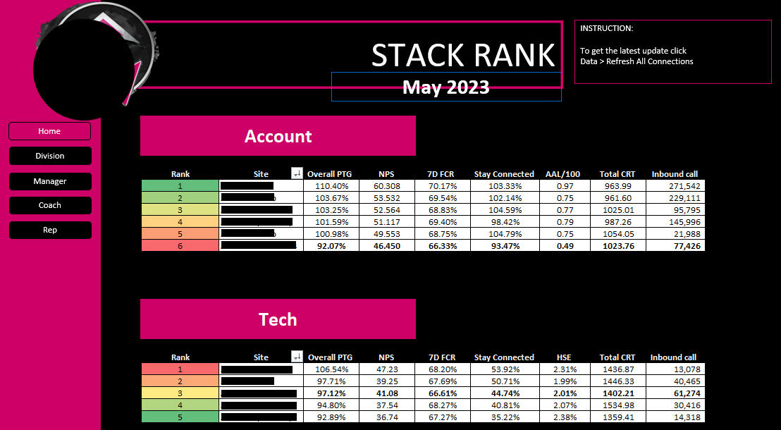 Rather than waiting for access that wasn't coming, I built a local reporting layer using the tools available such as Excel, Power Automate, SharePoint, and Microsoft Forms. Pulling from Power BI exports to keep data current without needing direct access. I collaborated with the director and senior managers to identify the metrics that actually mattered beyond the standard KPIs, agreed on the calculations, and built dashboards that leadership could use daily. Deliverables included NPS performance tracking, stack ranking across sites, monthly incentive bonus calculators, compliance monitoring, outlier tracking, and a quick response dashboard. All consolidated into a SharePoint hub accessible to the entire operation.